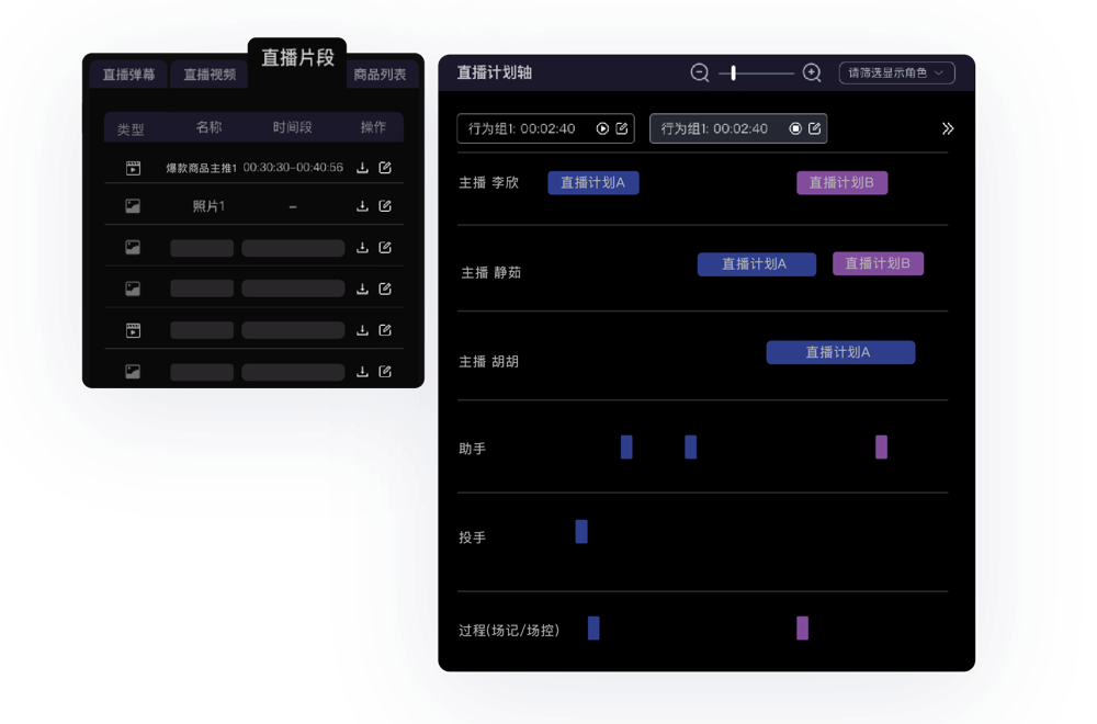 “54321!上5号链接!催卖!拉停留!” 直播间内职责多,难规划?直播间每个成员角色重点行为模块化,高效预设、快速调整;让直播过程中的所有高光时刻可沉淀可复用,快速拉升直播效果
