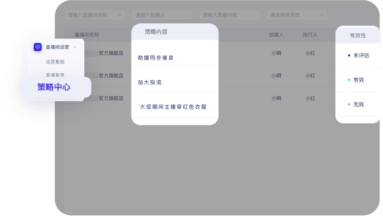 1. 可根据直播中任一独立循环的实时效果,第一时间将更合理的话术、 投流、行为动作等内容更新入下一循环,并同步各环节人员,及时调整 2. 帮助直播团队客观评估直播效果,实现直播策略的快速迭代